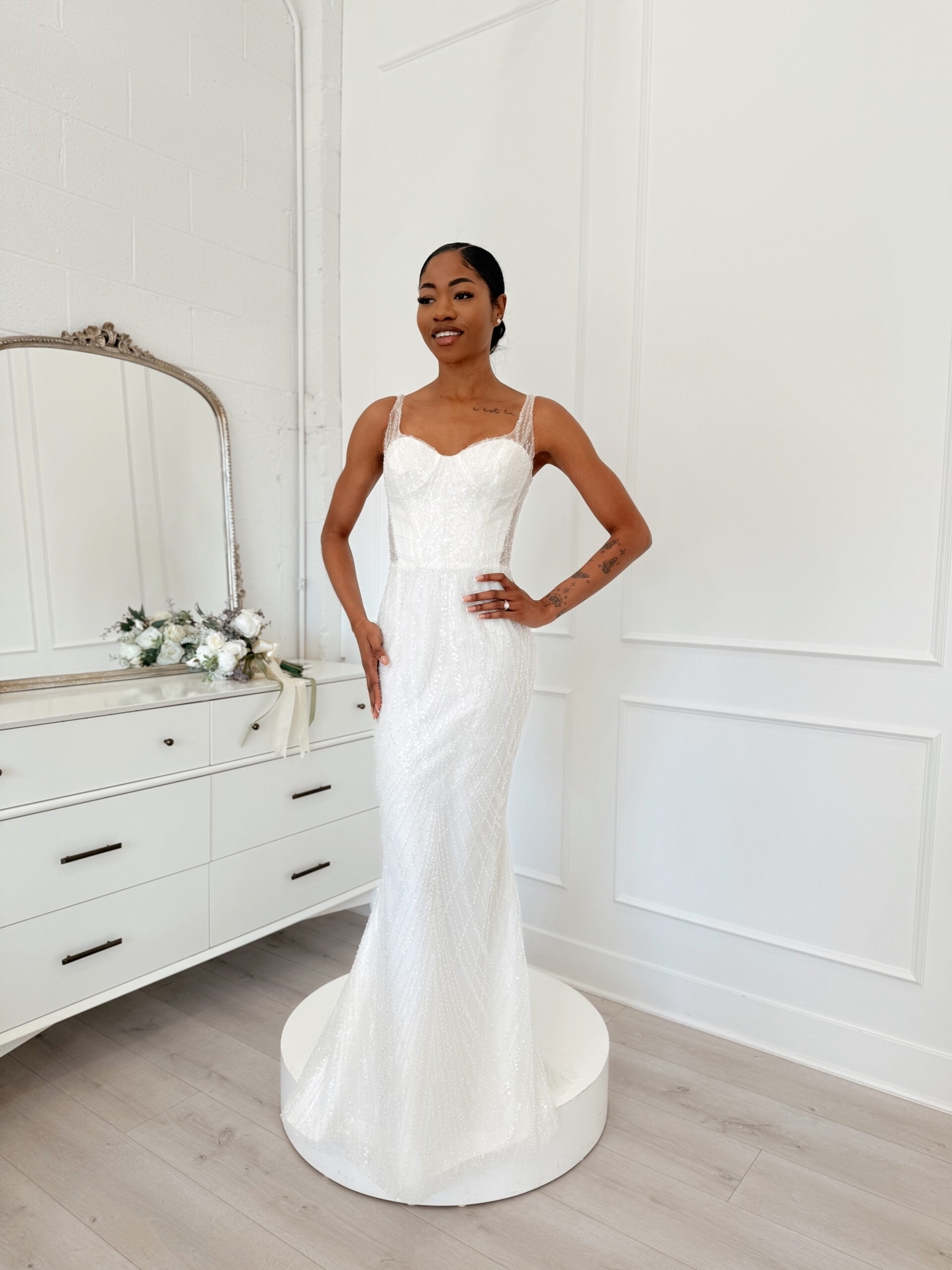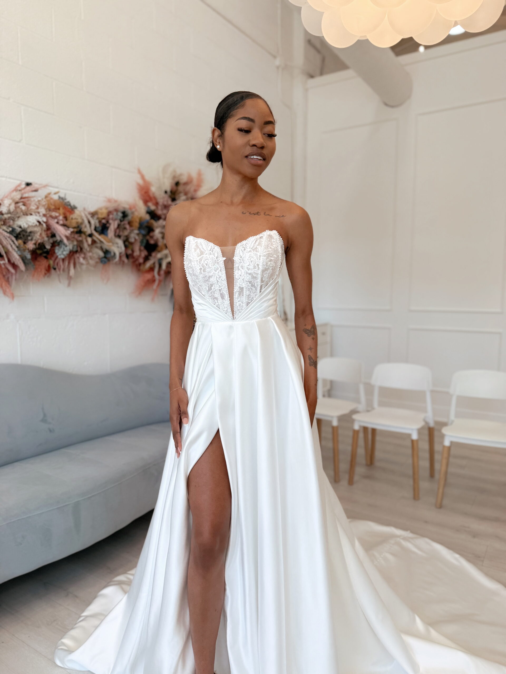 With styles that range from clean, structured silhouettes to flowing, ethereal designs, Beloved Bridal celebrates both modern minimalism and romantic tradition. You’ll find delicate layers of soft tulle, hand-placed lace, and luxurious crepe that glide effortlessly with every step—each fabric chosen to evoke movement, softness, and grace.